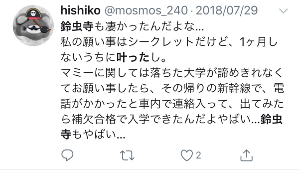 大学に落ちたのに諦めきれずお願い事したら、帰りに補欠合格ってすごいスピードで叶ってますね。想いが伝わったのでしょう。